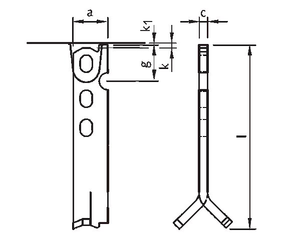 These anchors maintain uniform width top to bottom, featuring three holes at the head: the top one links to recess formers and ring clutches, while the lower two secure rebar. Only one side has a notch for rebar clamping, and the forked end angles outward to better transfer stress and heighten pull-out resistance in concrete.